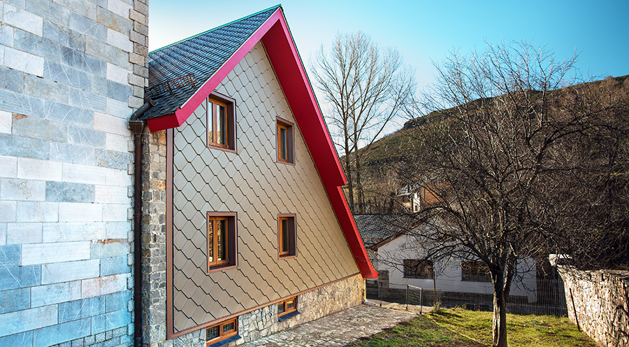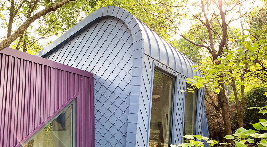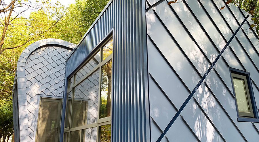 在歐美國家已普遍使用的鈦鋅板屋墻面系統(tǒng),通常使用環(huán)境友好型的鈦鋅、鈦、鋁、和鋁鎂錳等高級金屬材料,板型有直立鎖縫,伯爵板,梯形板,菱形及平鎖扣瓦片等系統(tǒng);而焊接直立鎖縫屋面系統(tǒng)則首選不銹鋼材料。鈦鋅板的使用壽命長,自愈功能強,環(huán)境友好,低維護率。原材料也可選彩涂鋼板,性價比極高,但對板型有一定影響。